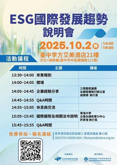 【資訊分享】10/2 經濟部國際貿易署「ESG國際發展趨勢說明會-臺中場」(免費參加)