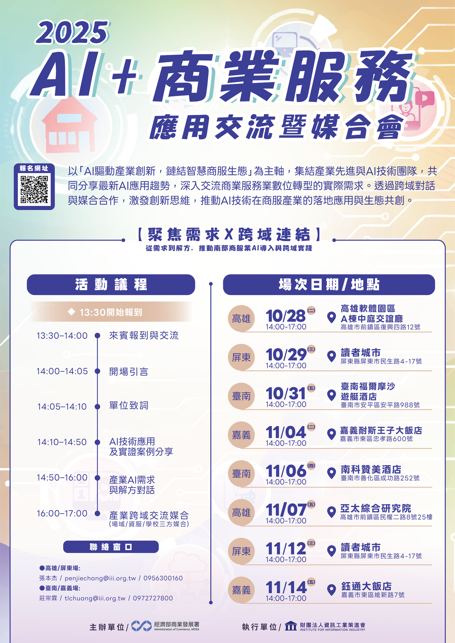 透過分享 AI 技術於產業的實證案例,促進業界之間的經驗交流與資源共享,帶動跨產業應用的擴散與深化。同時,藉由現場的需求對話與痛點盤點,讓商業服務業者能清楚表達實務上的挑戰,並與大專院校及資服業者共同探索可行的AI解決方案。