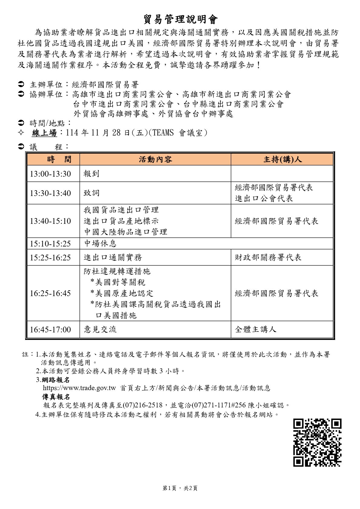 為協助業者瞭解貨品進出口相關規定與海關通關實務,以及因應美國關稅措施並防杜他國貨品透過我國違規出口美國,經濟部國際貿易署特別辦理本次說明會,由貿易署及關務署代表為業者進行解析,希望透過本次說明會,有效協助業者掌握貿易管理規範及海關通關作業程序。本活動全程免費,誠摯邀請各界踴躍參加!