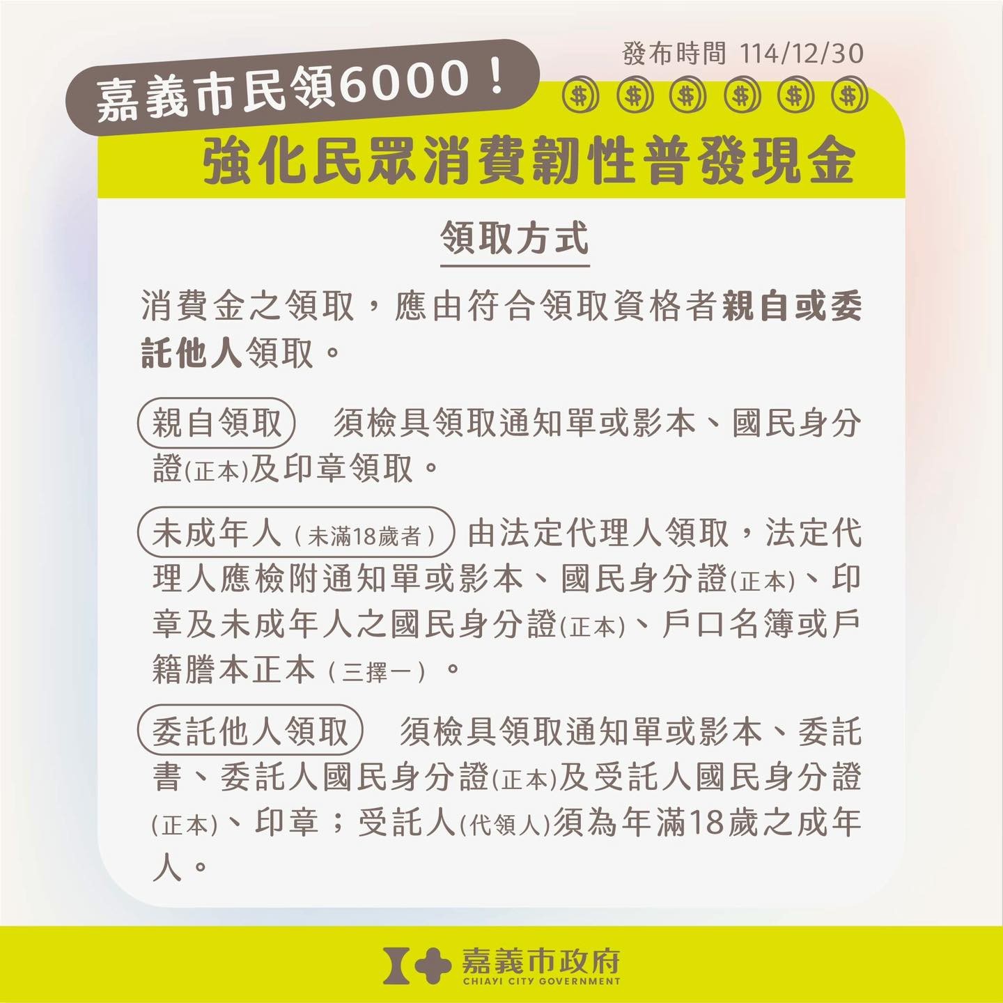 【資訊轉知】嘉義市政府強化民眾消費韌性普發6,000元現金(限設籍嘉義市之市民)