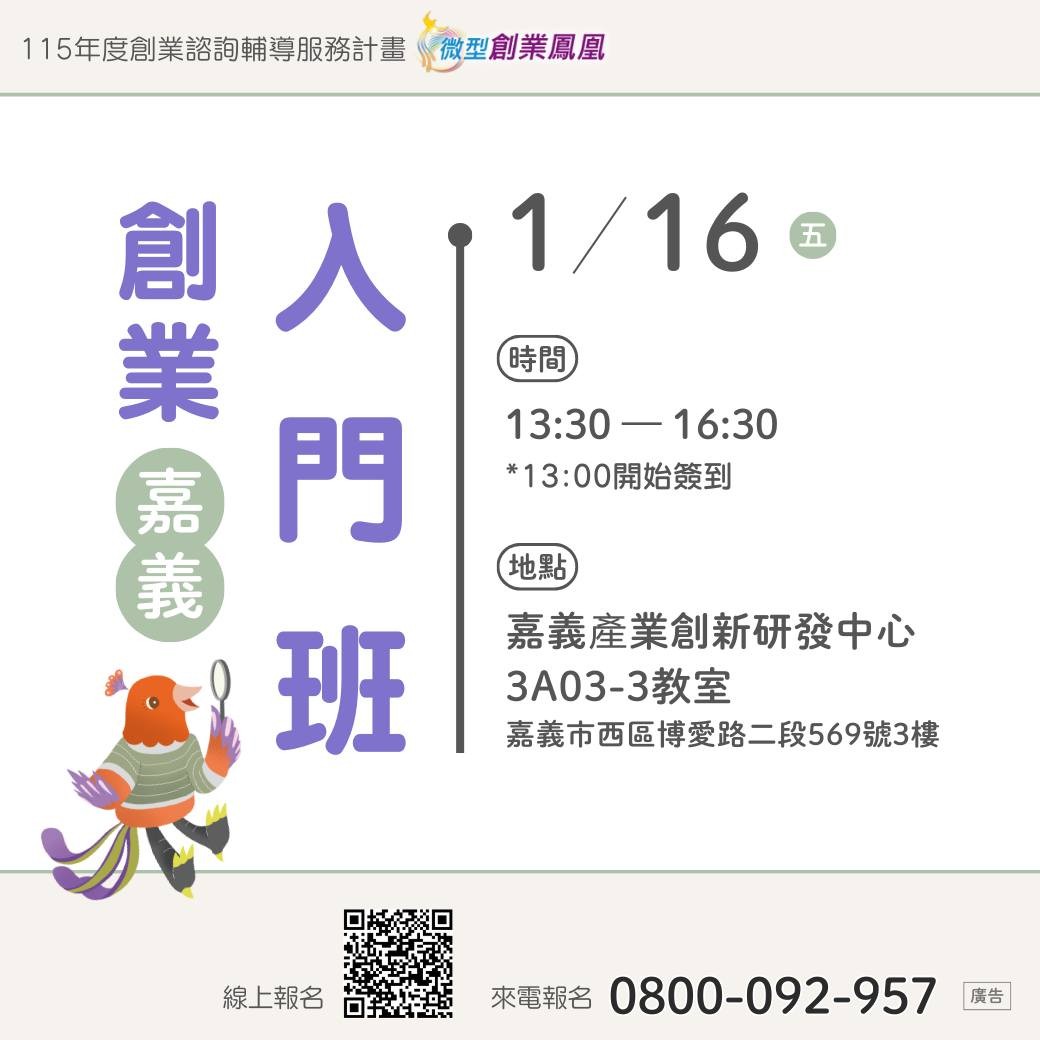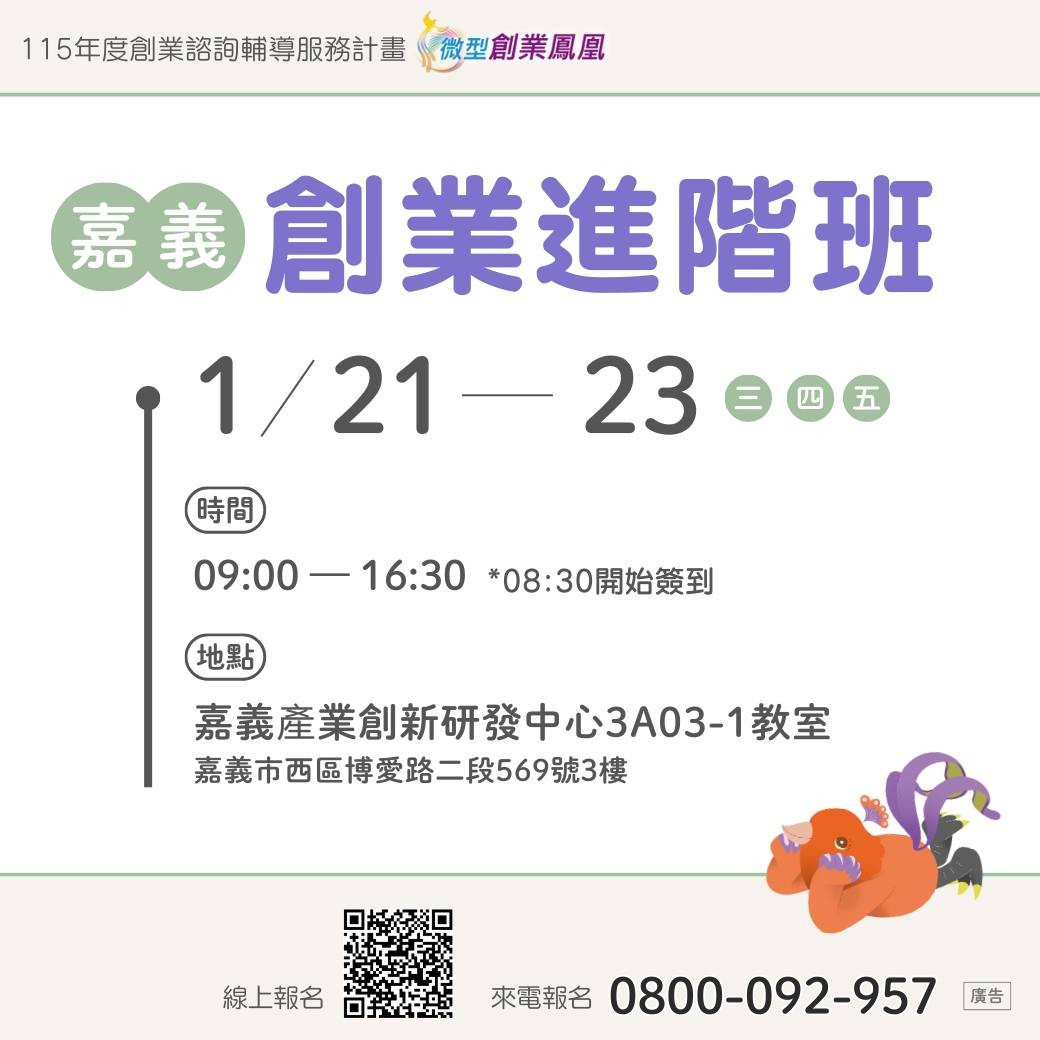 【資訊分享】1/16、1/21-23 勞動部勞動力發展署雲嘉南分署「微型創業鳳凰-創業入門班 / 進階班」在嘉義!(免費參加,額滿截止)