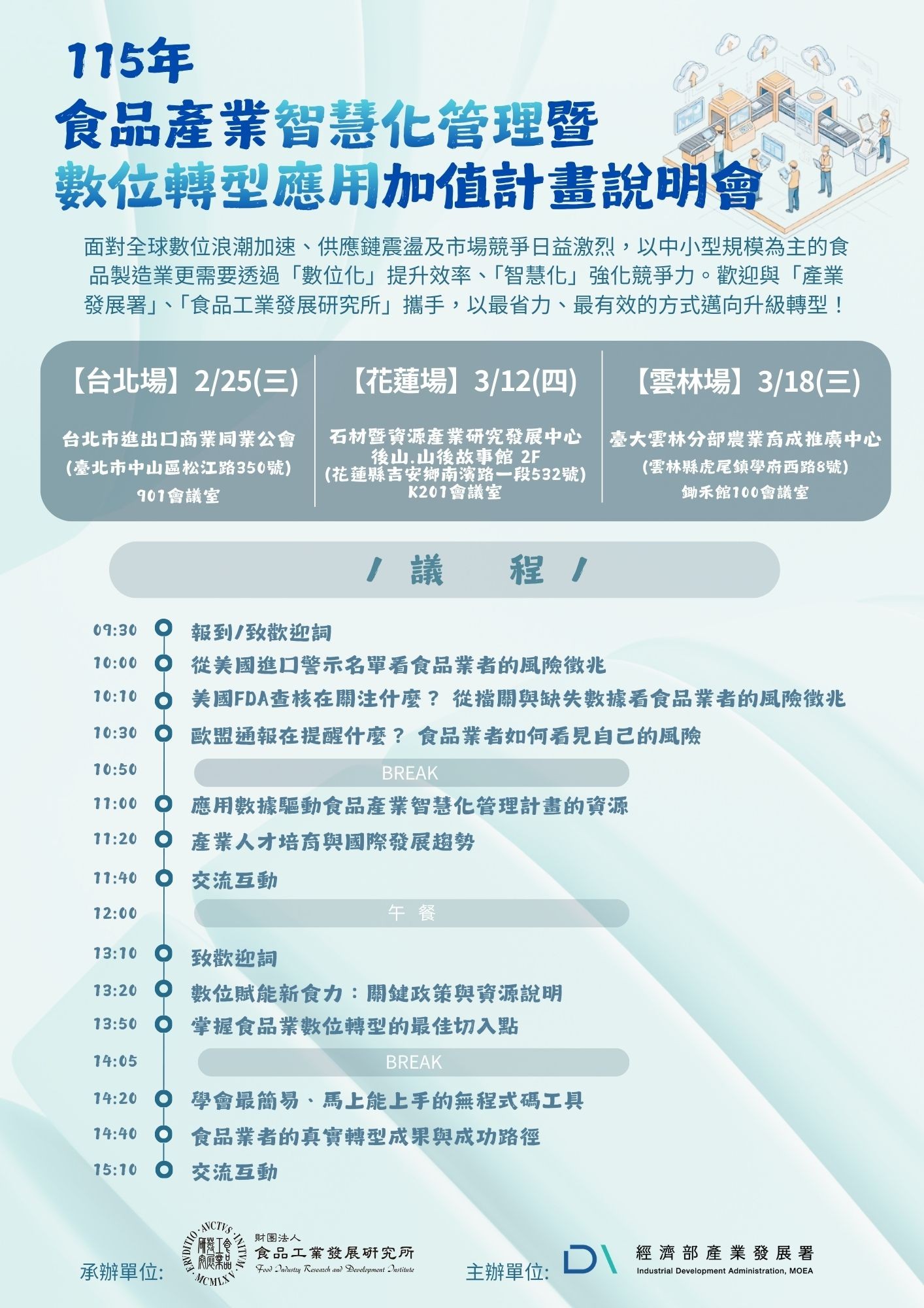 【資訊分享】經濟部產業發展署「115 年食品產業智慧化管理暨數位轉型應用加值計畫說明會」(2/25 臺北場、3/12 花蓮場、3/18 雲林場)(免費參加)