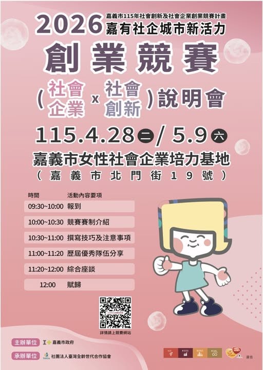 【資訊分享】4/28、5/9 嘉義市政府「115年社會創新及社會企業創業競賽說明會」