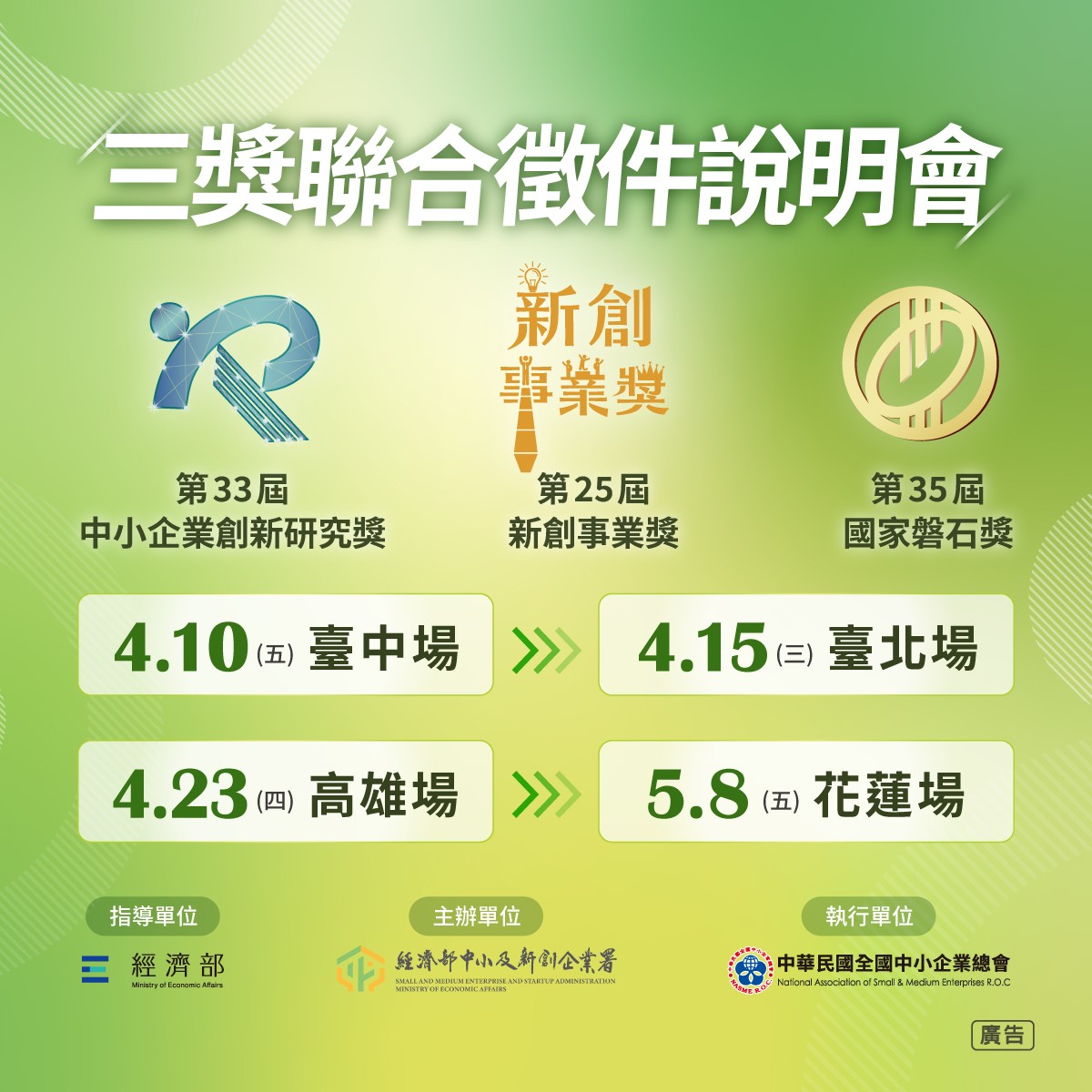 【資訊分享】4/10-5/8 經濟部中小及新創企業署「三獎聯合徵件說明會」(免費參加)